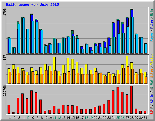 | Day | Hits | Files | Pages | Visits | Sites | kB F | kB In | kB Out | ||||||||